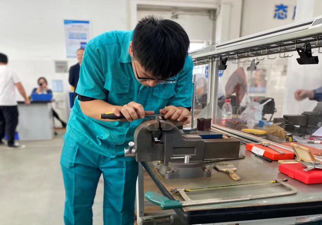 比赛正式拉开帷幕,参赛选手争分夺秒展开竞技。选手们在各自的工作台前对照图纸认真测量,实操工具在他们手上变得灵活而有生命力,只见他们在工作台上熟练地划线、钻孔、锯割、锉磨……持续一个半小时的比赛,气氛紧张而激烈。
